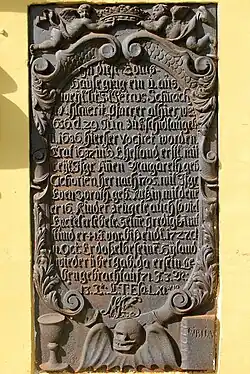 Memorial plate for the theologian and parish priest Peter Schirach (Pětr Šěrach) (1656–1727) in Kreba