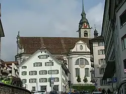 While a few Roman era coins have been found in Schwyz, the earliest evidence of a settlement comes from the 8th century. The Alamanni cemetery at the parish church and the church itself are both from the first half of the 8th century. This first church was followed by a second ottonian church around 1000, which may have been destroyed by the 1117 Verona earthquake. In 1121 the third church building, a romanesque building, was consecrated. This was followed in the 15th century by the much larger fourth church which was destroyed, along with much of the village, by fire in 1642. The fifth church, an early baroque church was replaced because of serious structural defects by the current late baroque church which was dedicated in 1774.[9]