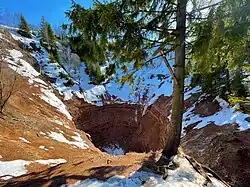 The Mushyl lake (Mari: Мӱшыл йер, Müšyl Jer), nicknamed the Sea Eye (Russian: Морской Глаз, Morskoy Glaz) is a minor karst lake in Shariboksad, Volzhsky District, Mari El, Russia. Located at the foot of the hill its bright green water is extremely deep (38.5 m) compared to the surface area (45x50 m).