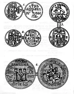 The first Serbian dinars, like many other Southern European coins, replicated Venetian grosso, including characters in Latin (the word dux replaced with the word rex).[2] For many years it was one of the main export articles of medieval Serbia, considering the relative abundance of silver coming from Serbian mines. While multiple foreign currencies circulated medieval Serbia, medieval dinar nevertheless maintained stable value from early thirteen till the mid fourteen century when 24 dinars were exchanged for 1 gold coin ducat.[2] Venetians were weary of this, and Dante Alighieri went so far as to put the Serbian king of his time, Stefan Milutin, in Hell as forgerer (along with his Portuguese and Norwegian counterparts):[2]