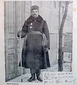 In 1903 he was ordained a hieromonk under the name Iliodor; two years later he graduated from the academy. There he met Father Gapon. Iliodor worked with the poor and expected that the clergy, not the revolutionaries could change the country. He was discovered by Theofan of Poltava and met Rasputin. Iliodor was appointed a lecturer at the seminary in Jaroslavl, but returned to the capital within a year. He was invited to the Peterhof Palace but scandalized his audience in a sermon, defending a land reform, which should be ordered by the Tsar. The Russian aristocrats and the Most Holy Synod were shocked with his behavior. The Synod decided to ban Iliodor, but Rasputin and the Tsar defended him. Instead Iliodor moved to Volhynia and lived in Pochayiv Lavra, the center of Panslavism. In a paper he attacked the revolutionaries and the Jews.[1] According to himself Iliodor turned against the right-wing Union of the Russian People and the Black Hundreds movement, because they believed in the Tsar's autocracy.
