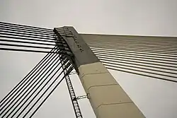 The symmetric cable-stayed system consists of two single column pylons, each inclined away from the main span at an angle of 78°, held by 10 pairs of back stays spread into two planes, and 22 main stay cables in one plane anchored on and pick up the middle spine of the main-span deck. The through-arch system, on the other hand, employs inclined hangers (from arches) anchored on and pick up the outer edges of the main-span deck. With support at the middle and the outer edges, the main-span bridge deck can be made relatively lightweight and slender.