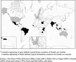 Sex tourism is known to be a multibillion-dollar industry.[4] with service industries such as the airline, taxi, restaurant and hotel industries profiting.[5] The bulk of sex tourism involves men traveling from countries in the Global North to countries in the Global South, such as in East and Southeast Asia and Latin America.[6] Although rarer, female sex tourism also exists. According to C. Shakeshaft, women commit at least 25% of sexual offences against minors[7]