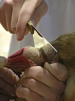 In the case of fowl (with the exception of large fowl like turkey) the bird is held in the non-dominant hand in such a way that the head is pulled back and the neck exposed, while the cut made with the dominant hand.[11]