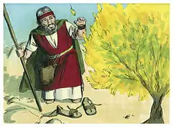 In the fourth reading, in chapter 3, when Moses was keeping his father-in-law Jethro's flock at the mountain of God, Horeb (another name for the Biblical Mount Sinai), the angel of God appeared to him in a flame in the midst of a bush that burned but was not consumed.[39] God called to Moses from the bush, and Moses answered: "Here I am."[40] God told Moses not to draw near, and to take off his shoes, for the place on which he stood was holy ground.[41] God identified as the God of Abraham, Isaac, and Jacob, reported having seen the Israelites' affliction and heard their cry, and promised to deliver them from Egypt to Canaan, a land flowing with milk and honey.[42] God told Moses that God was sending Moses to Pharaoh to bring the Israelites out of Egypt, but Moses asked who he was that he should do so.[43] God told Moses that God would be with him, and after he brought them out of Egypt, he would serve God on that mountain.[44] Moses asked God whom he should say sent him to the Israelites, and God said "I Will Be What I Will Be" (אֶהְיֶה אֲשֶׁר אֶהְיֶה, Ehyeh-Asher-Ehyeh), and told Moses to tell the Israelites that "I Will Be" (אֶהְיֶה, Ehyeh) sent him.[45] God told Moses to tell the Israelites that the Lord (יְהוָה, YHVH), the God of their fathers, the God of Abraham, Isaac, and Jacob, had sent him, and this would be God's Name forever.[46] The fourth reading ends here.[47]
