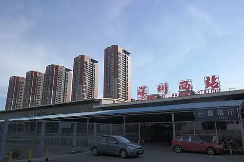 Shenzhen West railway station (Chinese: 深圳西站; pinyin: Shēnzhèn Xī Zhàn; Jyutping: sam1 zan3 sai1 zaam6) is a railway station on the Pingnan railway in Shenzhen, in the southern Chinese province of Guangdong. Constructed as a freight station in 1989, Passenger station was built during 1993, opening in 1994 for passenger use. In late 2003 it was renovated and enlarged from a few hundred square metres in area to about 3,800 m2 (41,000 sq ft). Shenzhen West railway station, originally known as Nantou railway station, is located on Xuefu Lu, Nanshan District. It is about 10 kilometers from Shekou Port. It was closed on October 11, 2022.