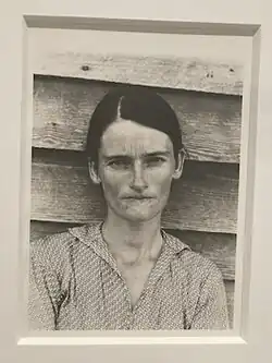 Levine is best known for her series of photographs, After Walker Evans, which was shown at her 1981 solo exhibition at Metro Pictures Gallery in New York.[9] The works consist of well-known Walker Evans photographs, rephotographed by Levine from an Evans exhibition catalogue and then presented as Levine's own artwork without manipulation of the images.[9] The Evans photographs — made famous by his book project Let Us Now Praise Famous Men, with writings by James Agee — are widely considered to be the quintessential photographic record of rural American poor during the Great Depression.[10] The Estate of Walker Evans saw the series as a copyright infringement, and acquired Levine's works to prohibit their sale.[11] Levine later donated the whole series to the estate. All of it is now owned by the Metropolitan Museum of Art, New York.[12] Levine's appropriation of Evans's images has since become a hallmark of the postmodern movement.[13] By rephotographing and re-feminizing this series, Levine makes the images more transparent in their message, rather than focusing on authorship. Including herself in this series can be seen as the artist's gesture of solidarity with the subject.[14]