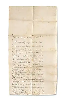 A copy of a letter from Prince Hyder, requesting military aid from Fath-Ali Shah r.1797-1834), the King of Qajar Iran. Copy created in Iran, Persian manuscript, the original dated 22nd March 1807, the copy roughly contemporary