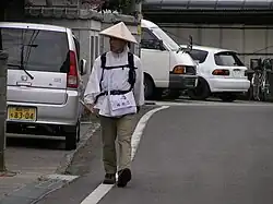 Henro (遍路) is the Japanese word for pilgrim,[5] and the locals along the route address the pilgrims as o-henro-san (お遍路さん). They are often recognizable by their white clothing, sedge hats, and kongō-zue or walking sticks. Alms or osettai (お接待) are frequently given to pilgrims by Shikoku's residents.