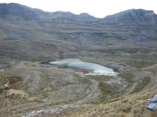 The Sierra Nevada del Cocuy region corresponds to the highest elevations of the Eastern Cordillera of the Colombian Andes. The geologic origins of this mountain range are complex, but have been hypothesized to be the inversion of a Mesozoic extensional basin which gave way to a sedimentary basin that accumulated sediments for millions of years before its closure in the Paleogene.[5][6] The inversion and resulting shortening and compression values have been estimated to be in the order of 60 ± 20 km.[7][8] Additionally, it has been proposed that the relatively high topography of the Eastern Cordillera of the Colombian Andes around these areas is due to flat slab subduction of the Nazca plate under the South American plate for ~7.5 Million years .[9]