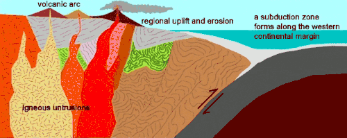 In early Triassic time, an extensive volcanic arc system called the Sierran Arc began to develop along the western margin of the North American continent. In Southern California, this volcanic arc would develop throughout the Mesozoic Era to become the geologic regions known as the Sierra Nevada Batholith, the Peninsular Ranges Batholith, (in the Peninsular Ranges), and other plutonic and volcanic centers throughout the greater Mojave Desert region.[1][2]