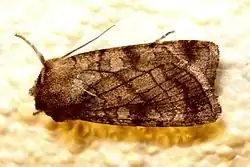 Larva yellowish brown; dorsal and subdorsal lines pale, the latter black -edged above. The larva feeds on various herbaceous plants including dock, plantain and various grasses.[2] The species overwinters as a larva.