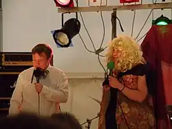 Jákup Veyhe (left) and Sjúrður Skaale (right, dressed as a woman) performing one of their Pipar & Salt (Pepper & Salt) comedies. Tvøroyri 2011.