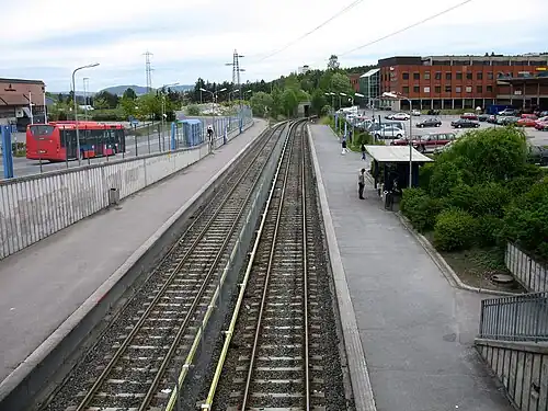 Skullerud (pronunciation) is a station on Østensjø Line of the Oslo Metro, located in the Østensjø borough, between Bogerud and Mortensrud. Since its opening 26 November 1967, it was the end station of the line until Østensjøbanen was extended to Mortensrud in 1997. The area around Skullerud station has a mixture of residential areas and businesses, including the former centers for Norsk Data and Tandberg Radio. The station is also a node for several bus lines.