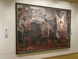 Slaughterhouse is an oil painting on canvas, 220 × 289 cm. The museum catalog dates the painting to 1919.[33][26] It was presented several times at large Russian and All-Union exhibitions. So it was shown at the 1st State Exhibition of Paintings in Kazan in 1920,[15][33] at the exhibition of the Association of Artists of Revolutionary Russia in Moscow in 1926, at the exhibition Nicolai Fechin and his Time in Kazan in 1981, there at the exhibition The Art of Tatarstan in the 1920s – 1930s in 1990[33] and at the exhibition of works of N. I. Fechin in the State Museum of Fine Arts. Fechin in the State Art Museum of Tatarstan in November 2006 – January 2007.[26]