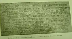 Photograph of one of the wooden planks (the n. 16) upon which the Book of Veles was written. The tables were supposedly found by Fodor Arturovich Isenbek in 1919 in a princely estate plundered by Red Guards, in the area of Kursk or Oryol, and in 1925 they were given to Yury Mirolyubov who transcribed and translated them.[71] The name Book of Veles was given to the Isenbek document in 1957 by Sergey Paramonov (or Lesnoy; 1898–1968), who also named velesovitsa the writing system in which the text was allegedly written.[72]