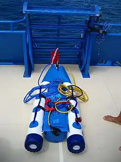 Snuba is form of surface-supplied diving that uses an underwater breathing system developed by Snuba International.[1] The origin of the word "Snuba" may be a portmanteau of "snorkel" and "scuba", as it bridges the gap between the two.[2] Alternatively, some have identified the term as an acronym for "Surface Nexus Underwater Breathing Apparatus",[3] though this may have been ascribed retroactively to fit the portmanteau. The swimmer uses swimfins, a diving mask, weights, and diving regulator as in scuba diving.[4] Instead of coming from tanks strapped to the diver's back, air is supplied from long hoses connected to compressed air cylinders contained in a specially designed flotation device at the surface.[5] Snuba often serves as a form of introductory diving, in the presence of a professionally trained guide, but does not require scuba certification.[6][7]