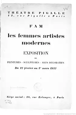 The Society of Modern Women Artists (La Société des femmes artistes modernes, FAM) was created in Paris in 1930 as an association for modern women artists. They organized an annual salon from 1931 to 1938. Through these exhibitions they showed modern works of art by French and international women artists, to establish the presence of women in art and to gain recognition from the general public.[1][2] FAM's exhibitions are considered "a significant force towards putting women artists on a more equal footing" with male artists in France.[3]