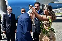 Former U.S. Secretary of State John Kerry receives traditional necklace upon arriving in Solomon Islands