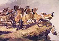 The discovery of the bones at Solutré gave rise to a legend relayed by popular culture,[19] according to which Paleolithic hunters guided herds of horses to the summit of the Roche, then threw them off the cliffs to kill them.