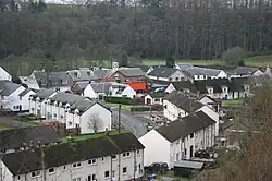 1950s council housing in Sorn; the brown building in the centre rear with the cream tower is the primary school