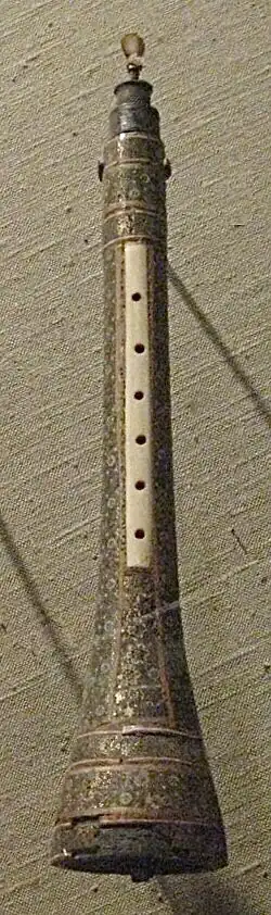 The word was most likely borrowed from an unknown Indo-European cognate of Luwian 𒍪𒌨𒉌 (zurni, “horn”), Sanskrit शृङ्ग (ṡṛṅga, “horn”), Latin cornū, and English horn, probably ultimately from Proto-Indo-European *ḱerh₂-. A folk etymology explains that the word sorna is a Pahlavi derivative of sūrnāy (literally "strong flute"), which is a compand of 'sūr-' (strong) and '-nāy' (flute).[1] According to such folk etymology, it was called "strong flute" due to its double-reed-construction rather than usual nāy (Persian: نای), which was made of a single tube of cane, while another folk etymology believes that the first part of word of sorna, is from sūr- again from Pahlavi and New-Persian, meaning the "banquet, meal and feast", thus the "banquet-flute".[1]