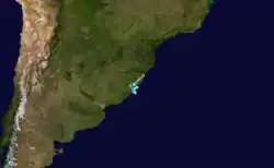 On 4 February 2021, an extratropical storm off the coast of Rio Grande do Sul developed into a bomb cyclone.[81] On 6 February, the storm began separating from its weather fronts and developed subtropical characteristics, before fully separating from the frontal zone and transitioning into a fully-tropical storm later that day. As a result, the NOAA classified the system as a tropical storm at 17:30 UTC, with the system being designated as Tropical Storm 01Q.[82] However, the storm was short-lived, as it lost its tropical characteristics several hours later, with the NOAA issuing their final bulletin on the storm at 23:30 UTC that day. The storm dissipated soon afterward.[83][84] Although the NOAA issued bulletins on the storm, the Hydrographic Center of the Brazilian Navy did not monitor it.