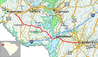 SC 24 begins at an intersection with U.S. Route 76 (US 76) and US 123 (East Main Street) in Westminster, within Oconee County, where the roadway continues as Oak Street. It travels to the southwest and immediately curves to the southeast before leaving the city limits. The highway passes by Pleasant Hill Cemetery and travels through rural areas of the county. Then, it has an intersection with SC 11. The highway continues traveling through rural areas of the county and has an intersection with SC 182 in Oakway. During a short east-northeast section, there is a very brief concurrency with SC 59. The highway passes by Hays Cemetery. SC 24 enters Anderson County and almost immediately has an interchange with Interstate 85 (I-85) which includes an intersection with SC 243 at its northern terminus. It crosses over part of Lake Hartwell on an unnamed bridge. A short distance later, it begins a concurrency with SC 187 at the Portman Shoals Intersection. The two highways cross over another part of the lake on the Calvin Wesley Belcher Bridge. It then enters West Gate, where SC 187 leaves the concurrency. SC 24 travels along the southern city limits of Centerville and passes just north of Anderson Regional Airport. In West Anderson, the highway passes Lakeside Middle School and intersects SC 28. About one mile (1.6 km) later, it enters the city limits of Anderson. Just under 4,000 feet (1,200 m) later, it meets its eastern terminus, an intersection with US 29 Business (US 29 Bus.)/US 76/US 178/SC 28 Bus./SC 81 (Murray Avenue).[3][4]