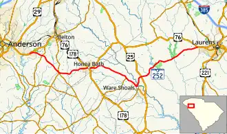 South Carolina Highway 252 (SC 252) is a 35.711-mile-long (57.471 km) state highway in the U.S. state of South Carolina. The highway connects the Anderson and Laurens areas with Honea Path and Ware Shoals. It has a unique feature in that it intersects U.S. Route 76 (US 76) three times along its length.