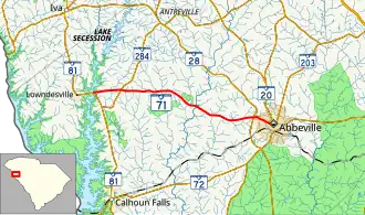 South Carolina Highway 71 Truck (SC 71 Truck) is a 4.870-mile-long (7.838 km) truck route that has approximately half its path outside the city limits of Abbeville. It has concurrencies with SC 20 Truck and SC 28.