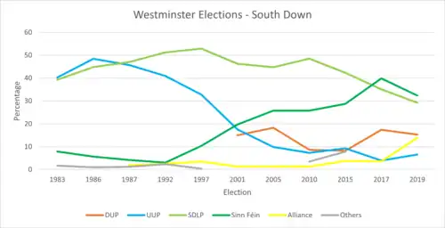 Since then, the unionist vote has declined further due to boundary changes, which excluded mainly unionist Dromore and Saintfield, and a trend for many unionists to tactically vote for the SDLP at Westminster elections to avoid the seat falling to Sinn Féin. However, in 2017, Sinn Féin gained the constituency for the first time with Chris Hazzard defeating former leader of the SDLP Margaret Ritchie as part of the SDLP's parliamentary wipeout at that year's snap general election.