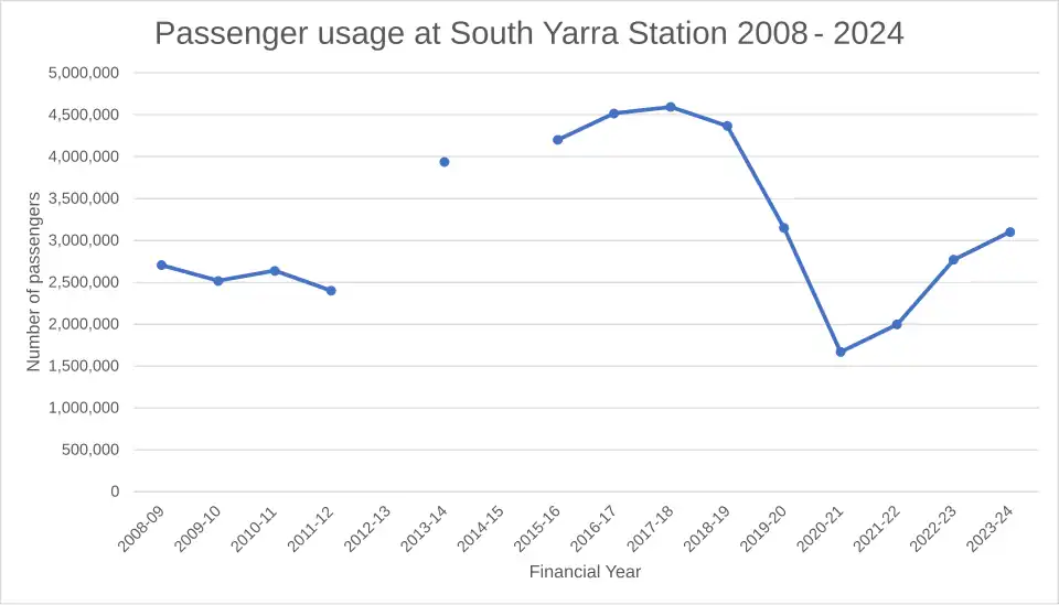 A chart showing passenger usage at South Yarra Railway Station in Melbourne, Australia, between 2008 and 2024 sorted by financial year.
