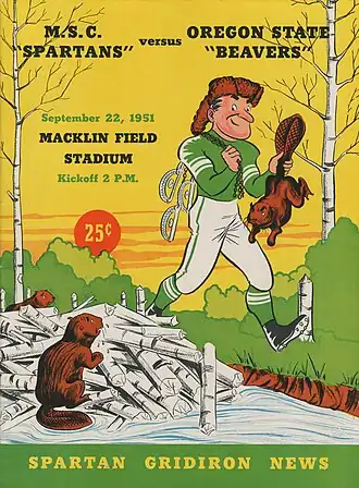 This 1951 image, predating Sparty, shows a Spartan football player as a beaver trapper.