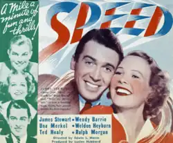Speed is a 1936 Metro-Goldwyn-Mayer action film directed by Edwin L. Marin. It starred James Stewart, in his first starring role, and Wendy Barrie. Although only a low-budget "B" movie, the film was notable for its realistic cinematography by Lester White, incorporating scenes from the Indianapolis 500 race and on-location shooting at the Muroc dry lake bed, used for high-speed racing by "hot rodders" in the 1930s.[1] Advance publicity trumpeted that Stewart drove the specially-prepared "Falcon" to 140 mph (230 km/h).[2]