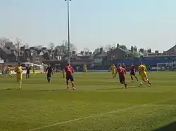 After the merger with Evenwood Town,[2] Spennymoor Town were granted the lease from the town council and decided to carry on using The Brewery Field for their home games. Most notably to the fans, the sign over the Wood Vue entrance had the 'United A.F.C.' removed and left with just 'Spennymoor'. In late 2012 and early 2013, a lot of upgrades were made to the ground, including brand new floodlights,[44] manufactured by local company Thorn Lighting to replace the old ones, which had been at the ground for over 40 years. Other improvements[45] were made, such as a tunnel for the players leading into the home and away dressing rooms and new dugouts on the far side of the pitch, as well as new terracing and access for disabled fans.[46] New work is planned to rebuild the old clubhouse[47][48][49] that was burnt down on Christmas Day 2003.