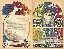 In use from at least as early as the 1870s, the technique was notably used in the 1960s by poster creators such as underground comic artist Gilbert Shelton, who designed posters for a music venue in Austin, Texas called The Vulcan Gas Company. The rainbow-like gradients and vivid swirls of color achievable via split-fount inking were effects that matched well with the psychedelic aesthetic of these works.[2]