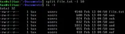 As seen above, the split command has broken the original file (keeping the original intact) into three, equal in number of lines (i.e., 1,000), files: xaa, xab, and xac.