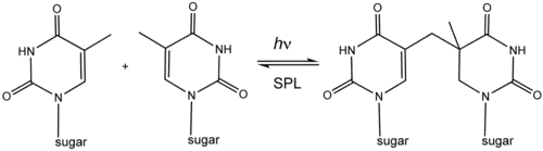 Spore photoproduct lyase is part of one of two main pathways which are used to repair cross linked 5-thyminyl-5,6-dihydrothymine caused by UV radiation: the spore-specific DNA repair system (which utilizes spore photoproduct lyase), and the general nucleotide excision repair pathway (NER).[7][8] The spore-specific DNA repair system is specific to SP, whereas the NER is able to repair other types of thymine dimers, such as CPDs and 6-4PPs.[7] Spores exhibit high UV susceptibility only when both repair pathways are compromised.[7]