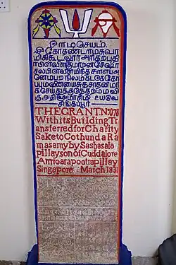 The temple grounds were expanded in 1831 when private land was donated to the temple. This event is recorded on a stone tablet which still stands in the temple. The text inscribed on this tablet reads: "The grant N:075 With its building transferred for charity sake to Cothunda Ramasamy by Sashasalapilly son of Cuddalore Amicarapoatrapilly Singapore March 1831".