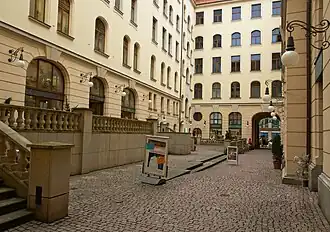Touristic attractions are the statue of emperor Maximilian[5] at the Universitätsstraße, the baroque stairway (with memorial badge at the former entrance to the Gewandhaus orchestra hall), Leipzig's oldest conserved elevator[3] and the 'Straße der Stars', a walk of fame-like exhibition of hand imprints of prominent people (e. g. Mariah Carey, Max Schmeling, Hans Dietrich Genscher) in the courtyard.