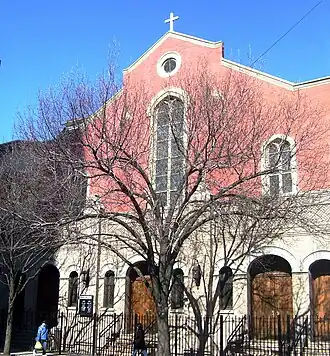 St. Columba's Church was built at the request of Catholic residents of the neighborhood of Chelsea, whose closest church was of St. Joseph in Greenwich Village. Bishop Hughes put Rev. Patrick Joseph Bourke in charge. Father Bourke first held services in a small frame building on the south side of 27th St. between 8th and 9th Avenues. He then obtained possession of a boathouse at 24th and 8th. The cornerstone of the church was laid by Bishop Hughes on May 22, 1845. The church was constructed by parishioners who employed as laborers on the west side docks, who would spend evenings at the site after loading and unloading ships all day. St. Columba's was dedicated on October 2, 1845 by coadjutor bishop John McCloskey.[1]