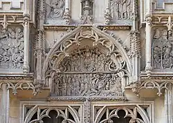 According to liturgical custom, the main entrance to the church is the west portal. Although it has three gates, this entrance has the simplest stone decoration. Two sides are without figure decoration. Above the main gate are two reliefs—one of them directly over the gate shows Christ in Getsemane garden piteously praying to His Father.