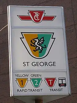 Some areas of the station contain wayfinding signage with the image of a crest with a dragon, referencing the Christian legend of St. George. However, St. George Street is actually named for Quetton St. George, a French-born British citizen who lived in Toronto in the 19th century.[6] The signs were designed by Paul Arthur and installed in 1993 as part of a new system of wayfinding signage, which was to be implemented in the entire subway system.[7] Ultimately, the TTC did not go through with the project but did not remove the prototypes either, preserving some of Arthur's designs.