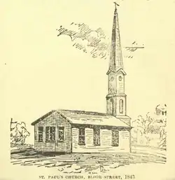 In 1841, the Rev. Alexander Sanson, rector of St. John's, York Mills, decided to establish an Anglican parish at the corner of Tollgate Road (now known as Bloor Street) and Yonge Street.[2] He commissioned the architect John George Howard to begin construction. This small wooden church, known as the 'little church up Yonge Street', opened on June 12, 1842. The first rector was the Rev. Charles Matthews, and the congregation originally had 100 parishioners. Tollgate Road became St. Paul's Road shortly after the church's construction, then the name was changed to Sydenham Road in 1844 and eventually to Bloor Street in 1854.[3]