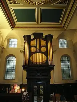 The present organ's oak case is the same one made to enclose the organ that was built for St Clement's in 1696 by Renatus Harris[16] who maintained the instrument until 1704.[17] While the case has remained largely intact, the organ itself has been variously rebuilt and restored; in 1704 by Christian Smith, and in 1711 by Abraham Jordan (c.1666–1716)—who it is thought added the swell organ to the two manual instrument. From 1838 the organ was in the care of Messrs Gray and Davison, who in 1872—as part of the renovation of the building—moved the organ from the west gallery to the south aisle. Care of the organ was transferred to Henry Wedlake that same year. In 1889 he rebuilt the instrument. Further work was undertaken in 1926 by Messrs J. W. Walker, and in 1936 by Messrs Hill, Norman and Beard, whew the instrument was moved back to an approximation of its original west-end location. The same company overhauled the organ in 1946, and in 1971 made 'neo-baroque' tonal revisions, which remain to this day. The instrument was last cleaned and repaired in 2004 by Colin Jilks of Sittingbourne, Kent.
