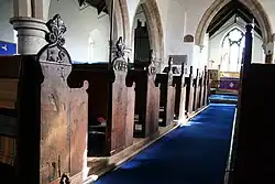 The south aisle was demolished in Elizabethan times but remains of it survive inside the church. The church includes part of a Saxon grave cover, originally part of a Celtic cross,[2] unusual early Tudor bench-ends with poppyheads featuring initials, possibly of churchwardens or their families[2][4] and Restoration plaques which record the work tradesman such as "putty makers". On the wall above the chancel arch is mounted a Royal Charter of George I Coat of Arms dated 1722.[4] There is also a memorial tablet to Francis Bond (1852–1918), the late 19th-century authority on Gothic architecture, who was born in the village.[1]