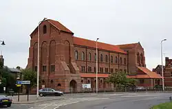 After the war, money was raised to build a new church. Designed by Stephen Dykes Bower, it incorporates glass salvaged from the old church and over 750,000 hand-made bricks.[2] Dating from 1955, the sanctuary windows are by AE Buss of Goddard & Gibbs.[3]