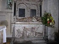 There are monuments in the church to the Burrell family, and in the south of the chancel an alabaster monument of 1616 to Sir Thomas Caryll and his family, restored about 1831 by the sculptor John Edward Carew. The composer John Ireland is buried in the churchyard, and is commemorated by a slate tablet on the south wall of the nave. In the north aisle is a tablet in memory of the German singer Anny Ahlers, who visited Shipley.[4][6]