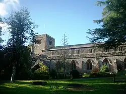The church is constructed in sandstone and limestone rubble with red sandstone dressings and slate roofs. Its plan consists of seven-bay nave with a clerestory, north and south aisles, a south porch, a chancel, and a west tower. The tower, dating from the 16th century, is in three stages, with buttresses at the angles, and an embattled parapet. It contains a west doorway, above which is a three-light window containing Perpendicular-style tracery. The bell openings have three lights, are louvred and have hoodmoulds. The north wall of the nave contains pointed windows with Perpendicular tracery, all with two lights, other than the western window, which has three lights. The west window has five lights. The windows in the clerestory have flat heads and three lights, and are mullioned. The south wall contains a priest's door, with four windows to its left and two to the right; all have two lights. The porch is gabled and has a cross finial. The east window in the chancel has five lights.[2] The inner doorway dates from the 12th century, it is in Norman style, and has zigzag decoration. Hyde and Pevsner in the Buildings of England series state that it is neither complete, nor is it in its original position.[9]