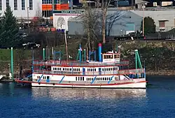 The sternwheeler MV Columbia Gorge, a 1983 diesel-powered replica steamboat, operates on the Willamette River in non-summer months.